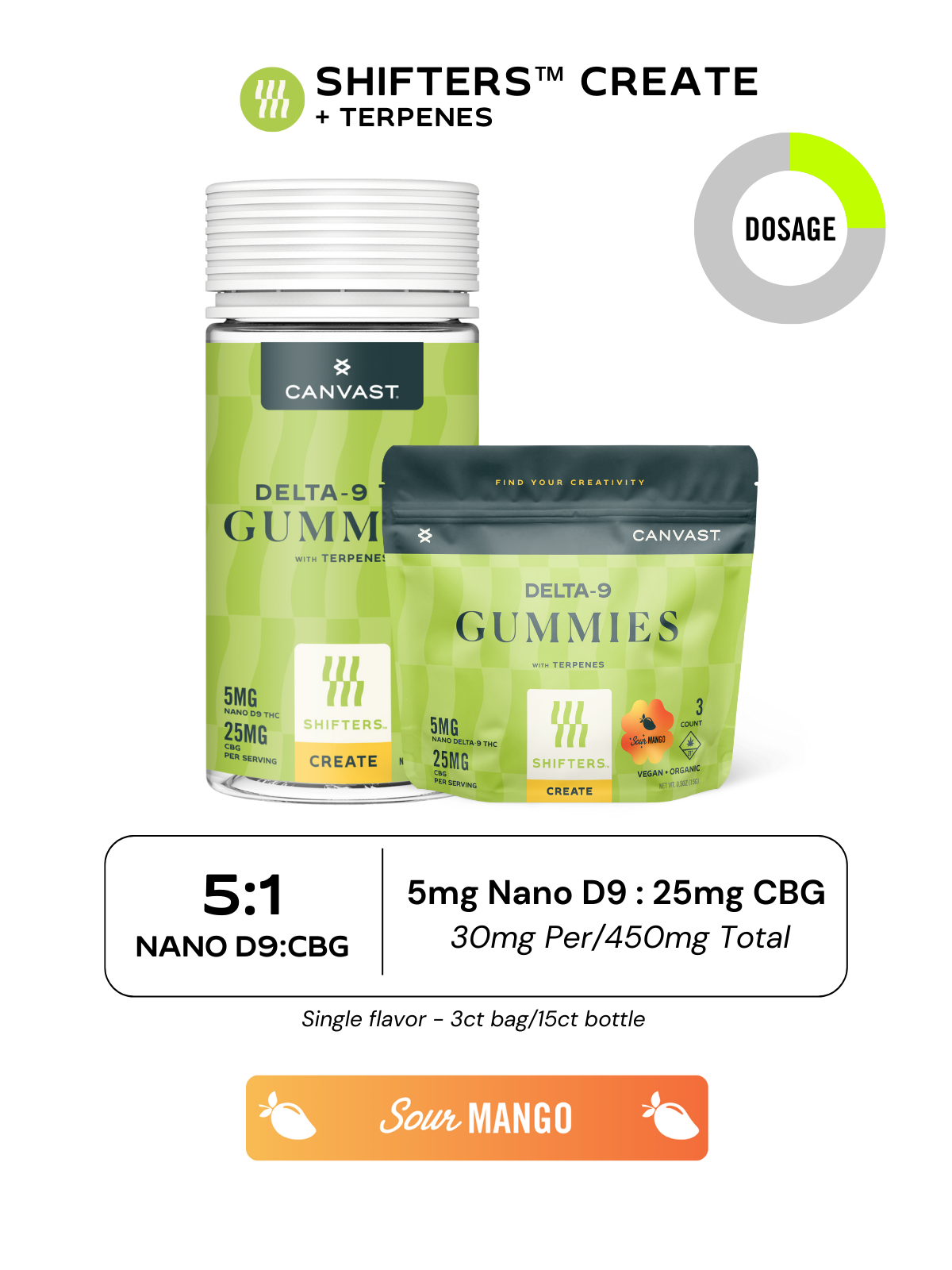 Juicy sour mango gummies crafted with a unique blend of Nano Delta-9 THC and CBG to help you relax, get inspired, and bring your ideas to life.